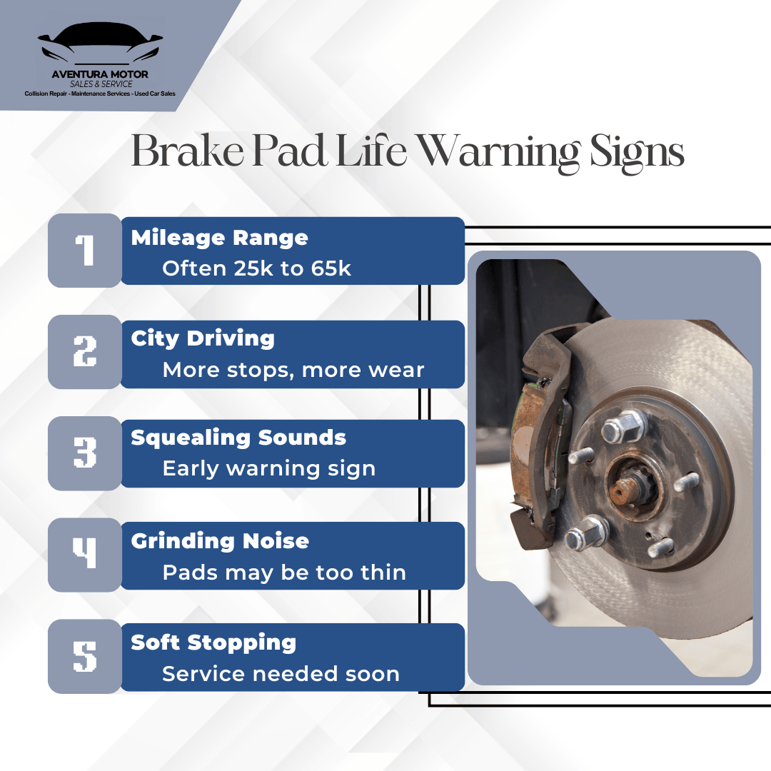 That range matters in Aventura. Stop-and-go traffic on Biscayne Boulevard, short local trips, heavy summer heat, and frequent braking around shopping areas or I-95 ramps can all wear pads faster than steady highway driving.